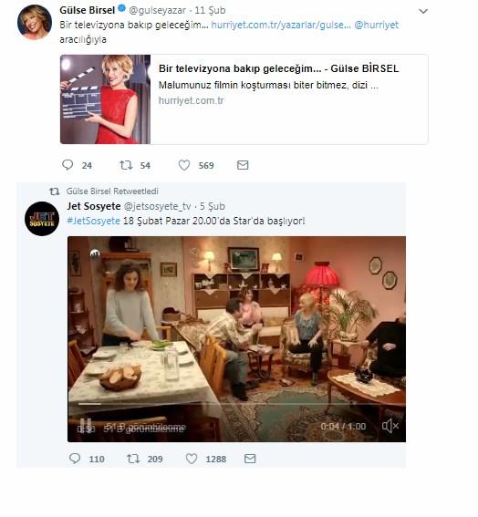 Aile Arasında filmi ile 5 milyon barajını aşan ve Jet Sosyete ile ekranlara jet gibi dönen Gülse Birsel, ülke gündemine dair haberlerin yanı sıra Jet Sosyete dizisinin tanıtımlarını ve köşe yazılarını da takipçileriyle paylaşıyor. Köşe yazılarını da paylaşan Birsel, takipçilerini beslemeyi ihmal etmiyor.